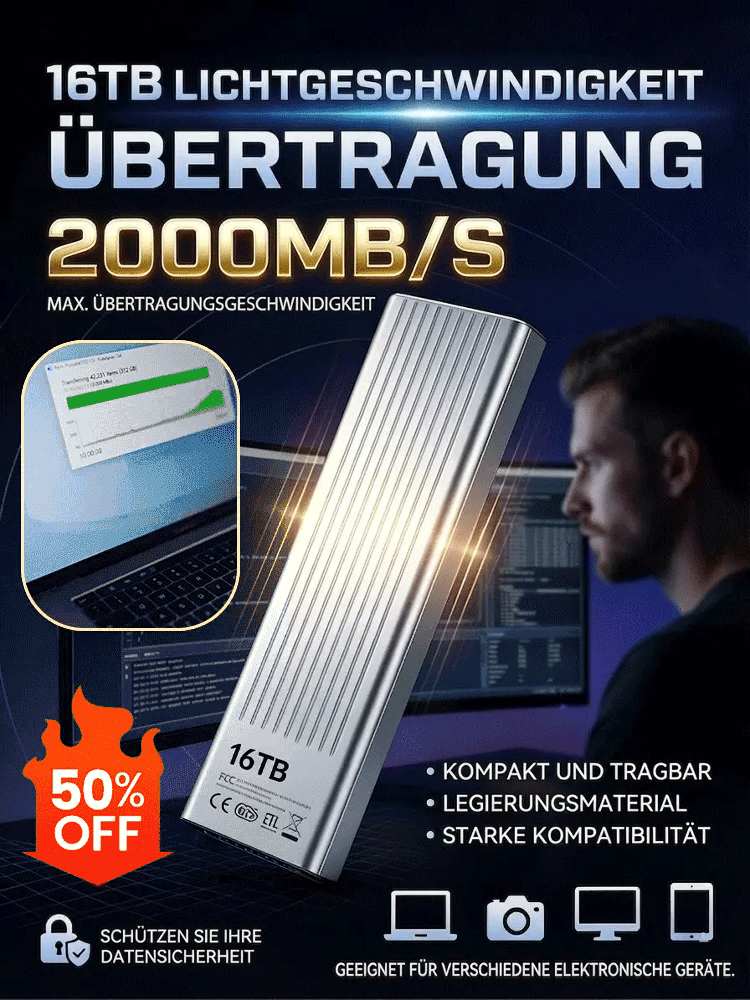 【16TB Tragbare SSD: Export-Räumungsverkauf zum Fabrikpreis!】 IP54 wasser- und stoßfester Speicher, kompatibel mit iPhone, Mac und PC – inklusive kostenloser Testphase.